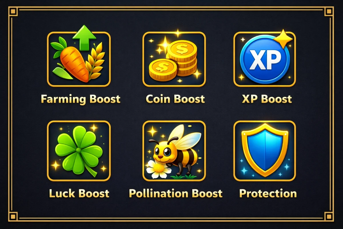 • Farming Boost: faster harvests or higher crop yield per cycle